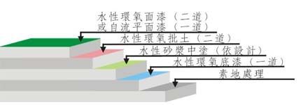 ⑤水性環(huán)氧面漆:用滾涂型水性環(huán)氧面漆二道,或鏝面型水性環(huán)氧面漆一道,完工后光澤柔和、顏色均一;